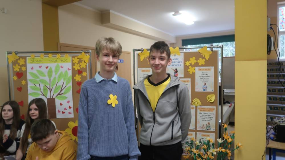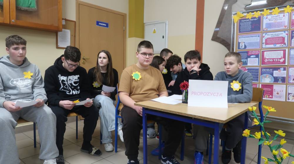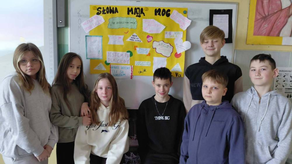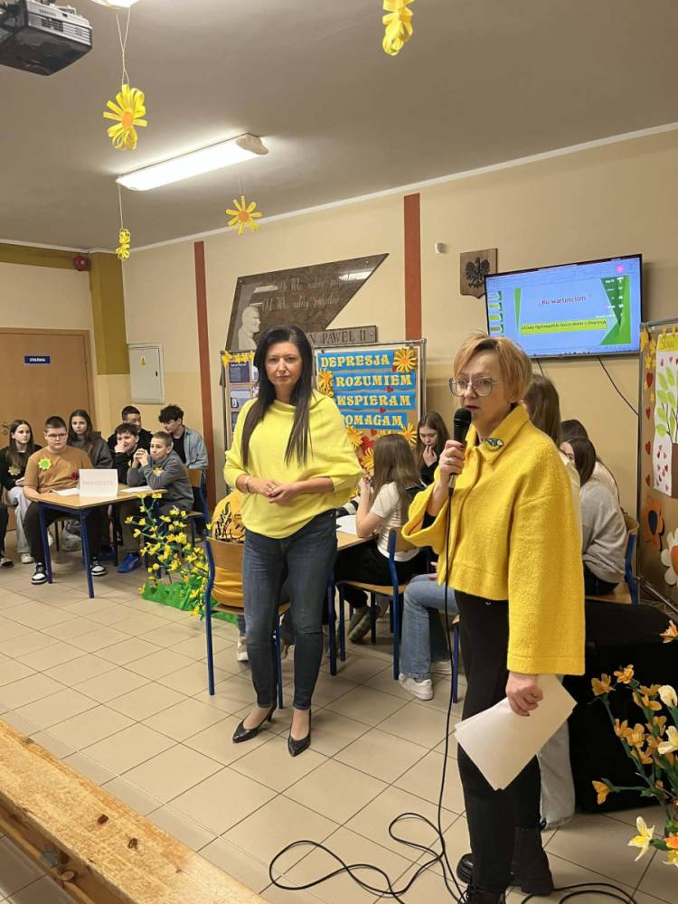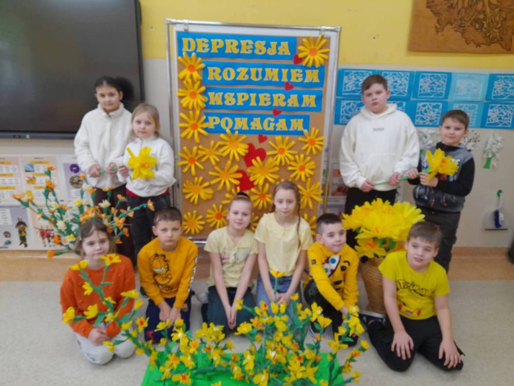 23 lutego obchodziliśmy w naszej szkole Ogólnopolski Dzień Walki z Depresją .To ważny dzień, który przypomina nam, jak istotne jest dbanie o zdrowie psychiczne - swoje i innych. Depresja to choroba nie ,,gorszy dzień ‘’! 23 luty to świetna okazja, by w szkole porozmawiać o emocjach, wsparciu i dbaniu o zdrowie psychiczne. W kontekście hasła ,,Ku wartościom ‘’ skupiliśmy się w ramach obchodów na: empatii, uważności, odpowiedzialności za słowa, odwadze proszenia o pomoc, wzajemnemu wsparciu. Świadomość skali problemu sprawiła, że społeczność szkolna aktywnie zaangażowała się w następujące działania edukacyjne i profilaktyczne. W klasach 1-3 zrealizowano zajęcia pod hasłem ,,Kolorowe emocje ‘’. Dzieci wysłuchały bajek terapeutycznych o smutku i radości oraz rozmawiały o tym, co robią, gdy czują smutek. Zwieńczeniem zajęć była wystawa prac plastycznych przedstawiających emocje. W klasach 4-5 przeprowadzono zajęcia pod hasłem ,,Słowa mają moc ‘’. Uczniowie wspólnie tworzyli klasową listę wspierających i życzliwych słów, podkreślając znaczenie wzajemnego szacunku i empatii. Uczniowie klas 6-8 wzięli udział w debacie oksfordzkiej pod hasłem ,,Ku wartościom -rozmowa ma moc ‘’. Rozważano ważne i aktualne tezy, takie jak :,,Media społecznościowe pogarszają samopoczucie młodych ludzi ‘’, ,,Szkoła ma realny wpływ na zapobieganie depresji ‘’ oraz ,,Rozmowa z rówieśnikami może realnie pomóc osobie w kryzysie ‘’.Debata stała się przestrzenią do refleksji nad rolą wsparcia, relacji i odpowiedzialności za siebie nawzajem. Podczas zajęć w świetlicy szkolnej dzieci dyskutowały o roli słów w przeciwdziałaniu depresji oraz o znaczeniu tańca jako formy wyrażania emocji i poprawy samopoczucia. Wokół magicznych słów życzliwości i wsparcia odtańczono Taniec Przyjaźni, który doskonale rozładował napięcie i poprawił nastrój uczestników zajęć. Oprócz tego dzieci wykonywały prace plastyczne wyrażające myśli i emocje bez użycia słów. Psycholog szkolny przeprowadził zajęcia profilaktyczne, podczas których przybliżył uczniom temat depresji, jej objawów oraz skutecznych metod zapobiegania i szukania pomocy. Tego dnia młodzież ubrała się na żółto -kolor symbolizujący wsparcie, nadzieję i solidarność z osobami zmagającymi się z depresją .Na terenie szkoły przygotowano również gazetki informacyjne dla uczniów i rodziców .Akcja zakończyła się wspólnym wysłuchaniem piosenki ,,Wokół nas ‘’,która stała się symbolicznym podsumowaniem dnia-przypomnieniem, że wsparcie, życzliwość i uważność na drugiego człowieka są zawsze blisko nas.